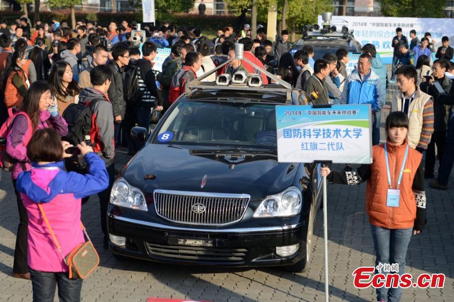 Photo taken on November 15, 2014 shows self-driving cars in an unmanned vehicle contest in Changshu of Jiangsu province. Altogether 22 cars from China’s universities and research institutions will compete with each other in the Future Challenge 2014 contest, which started on Saturday. [Photo/ Wang Sizhe]