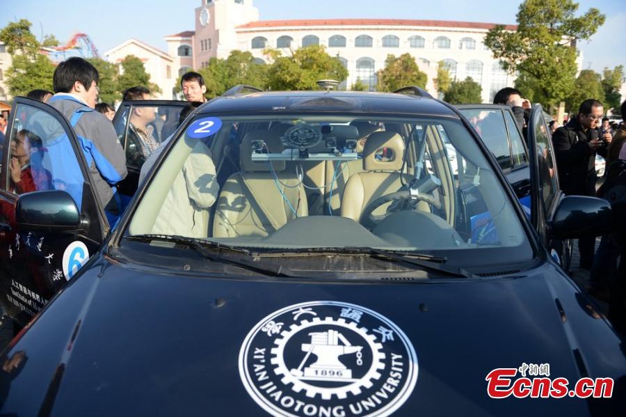 Photo taken on November 15, 2014 shows self-driving cars in an unmanned vehicle contest in Changshu of Jiangsu province. Altogether 22 cars from China’s universities and research institutions will compete with each other in the Future Challenge 2014 contest, which started on Saturday. [Photo/ Wang Sizhe]