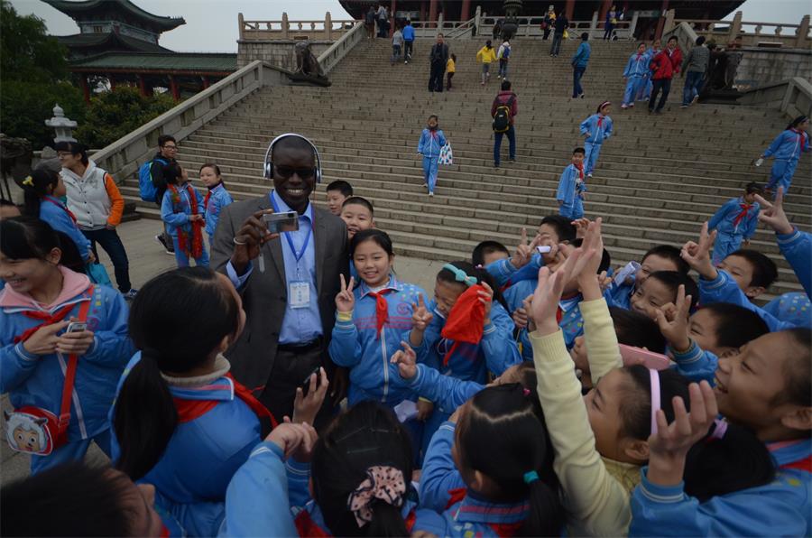 Photo taken on Nov.15, 2014 shows a foreigner and young pioneers. More than 40 reporters from foreign-language media in China will visit Jiangxi province until Nov. 20, 2014. (Photo/People's Daily Online)