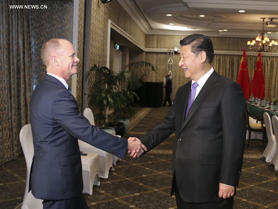 Chinese President Xi Jinping (R) shakes hands with Queensland Premier Campbell Newman during their meeting in Brisbane, Australia, Nov. 16, 2014. (Xinhua/Ding Lin)