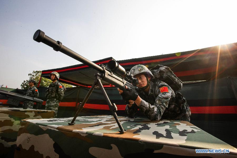 A Chinese soldier shows a sniper rifle at the starting ceremony of the Hand-in-hand India-China Anti-Terrorism Joint Training Exercise in Pune, India, on Nov. 17, 2014. The joint counterterrorism training exercise will last for ten days. (Xinhua/Zheng Huansong)