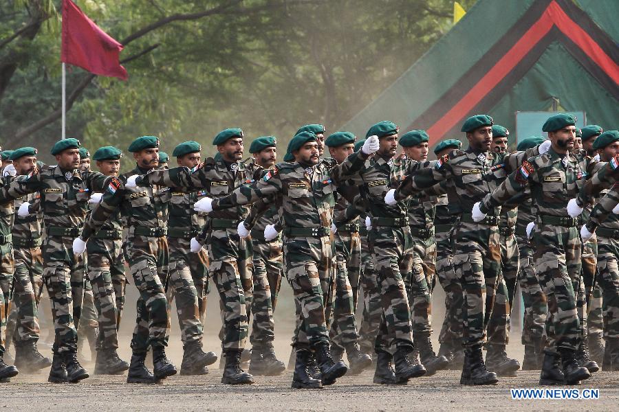 | Indian soldiers march at the starting ceremony of the Hand-in-hand India-China Anti-Terrorism Joint Training Exercise in Pune, India, on Nov. 17, 2014. The joint counterterrorism training exercise will last for ten days. (Xinhua/Zheng Huansong) |