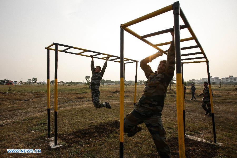 Chinese and Indian soldiers take part in the Hand-in-hand India-China Anti-Terrorism Joint Training Exercise in Pune, India, on Nov. 18, 2014. The joint counterterrorism training exercise will last for ten days. (Xinhua/Zheng Huansong)