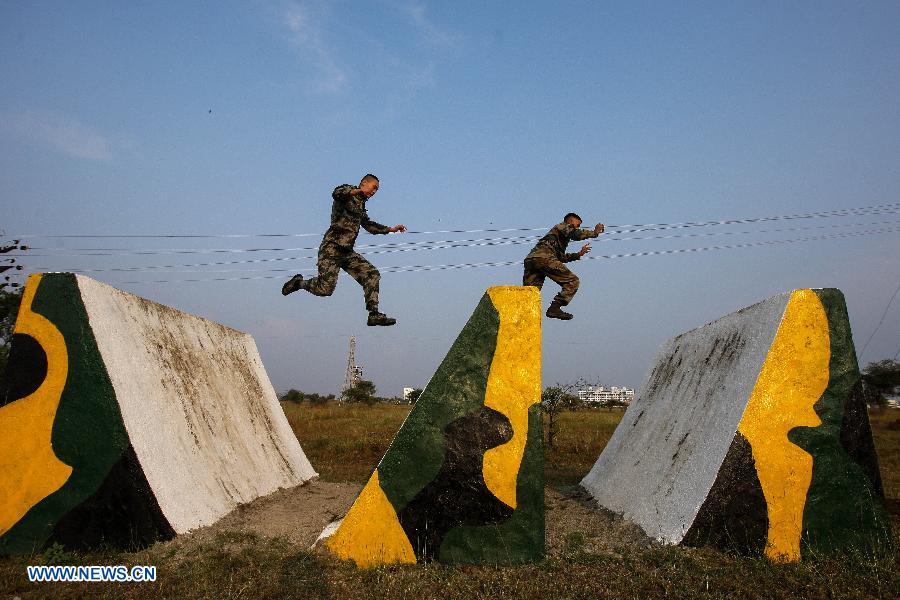 Chinese and Indian soldiers take part in the Hand-in-hand India-China Anti-Terrorism Joint Training Exercise in Pune, India, on Nov. 18, 2014. The joint counterterrorism training exercise will last for ten days. (Xinhua/Zheng Huansong)