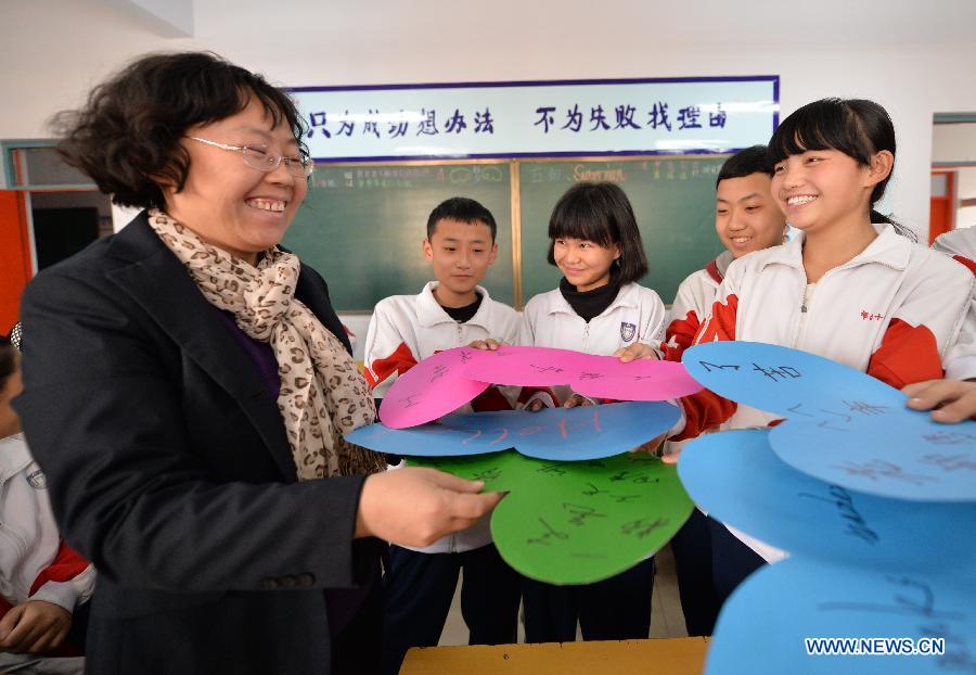 Students present heart-shaped greeting cards to a teacher at the No. 10 Middle School in Xingtai, north China's Hebei Province, Nov. 19, 2014, ahead of the World Hello Day which falls on Nov. 21. (Xinhua/Zhu Xudong)