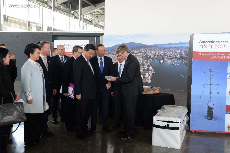 Chinese President Xi Jinping and Australian Prime Minister Tony Abbott watch a piece of ice sample collected from Antarctica in Hobart, Australia, Nov. 18, 2014. (Xinhua/Ma Zhancheng)