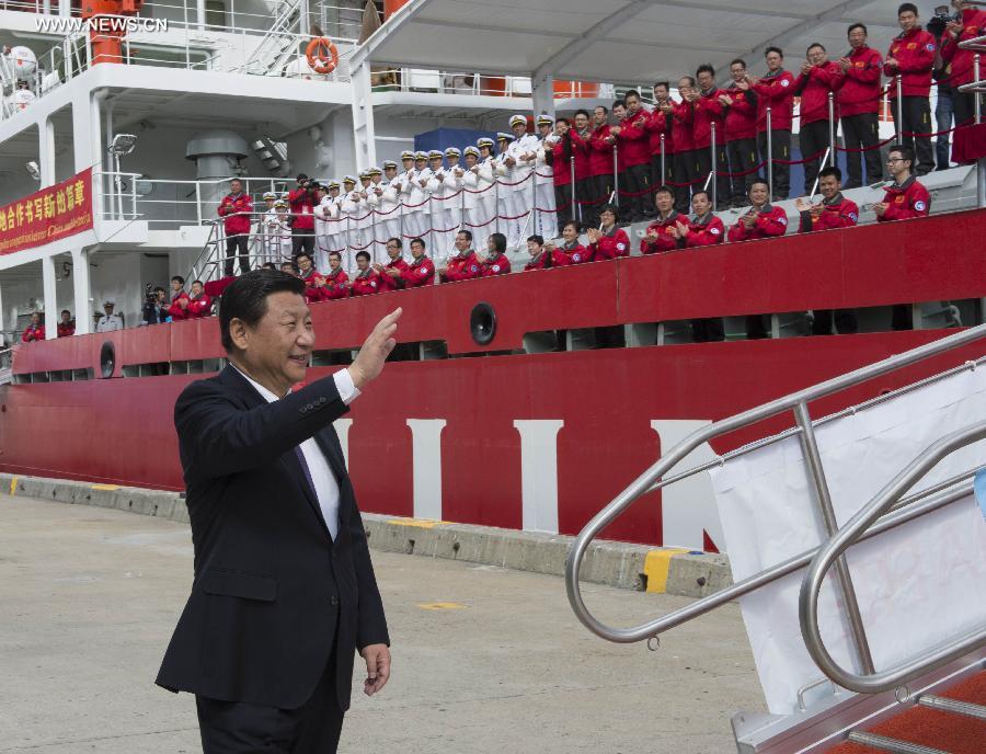 Chinese President Xi Jinping waves to crew members of Chinese research vessel and icebreaker Xuelong, or Snow Dragon, in Hobart, Australia, Nov. 18, 2014. (Xinhua/Li Xueren)