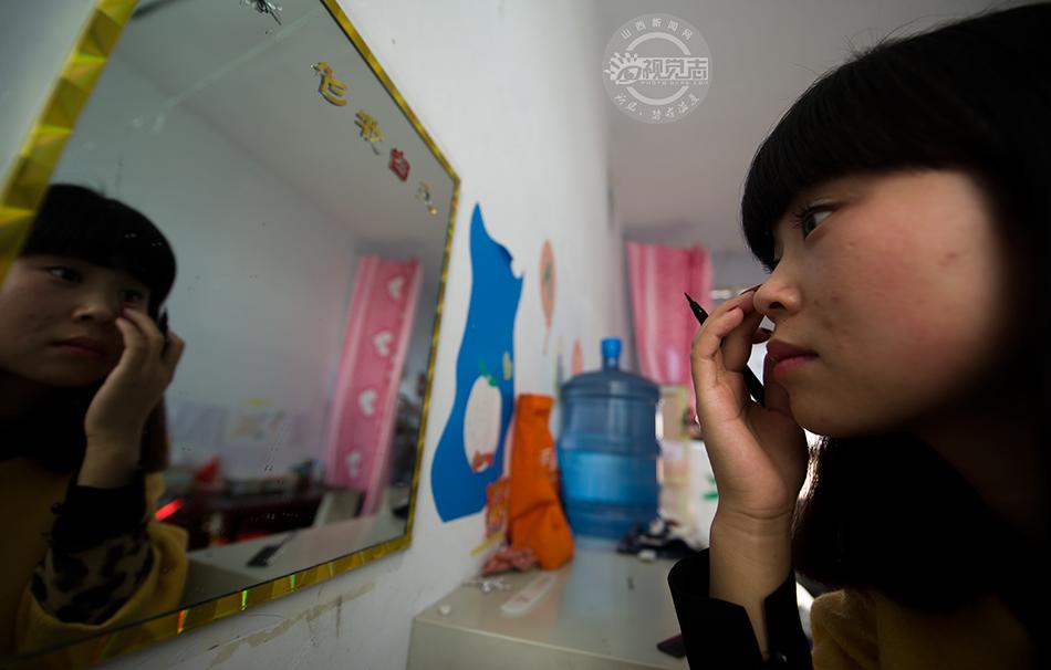 Yin Li does her make-up after gets up. (Shanxi News/Liu Yu)