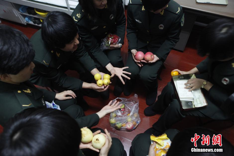 Female frontier soldiers share fruits in the room, Nov. 3, 2014. A frontier defense regiment under the Heilongjiang Provincial Military Command of the PLA has recruited its first group of post-90s female soldiers this year. (CNS/Wei Jianshun)