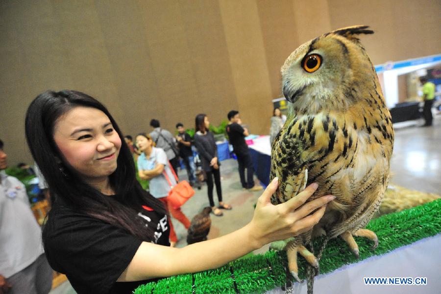 A woman looks at an Eurasian Eagle Owl during the exhibition of Pet Variety And The City 2014 at Impact Muang Thong Thani in Bangkok, Thailand, Nov. 20, 2014. The exhibition was held here on Nov. 20-23. (Xinhua/Rachen Sageamsak)