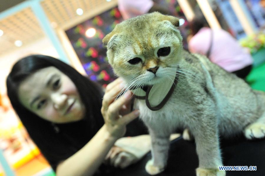 A woman looks at a Scottish fold cat during the exhibition of Pet Variety and The City 2014 at Impact Muang Thong Thani in Bangkok, Thailand, Nov. 20, 2014. The exhibition was held here on Nov. 20-23. (Xinhua/Rachen Sageamsak)