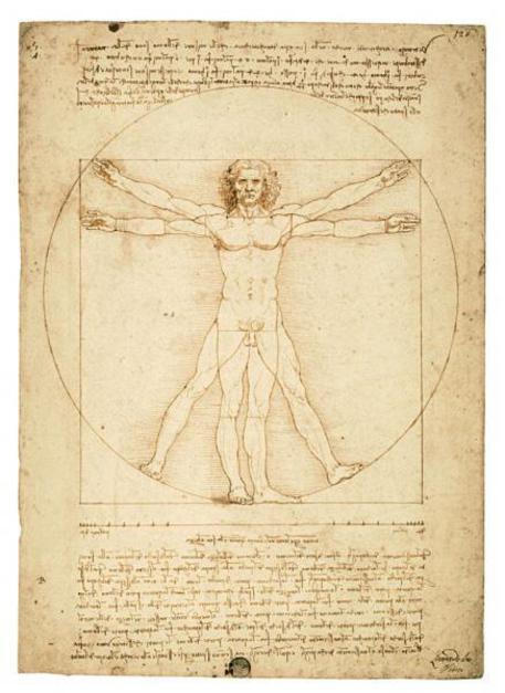 The iconic pen and ink drawing on paper - which in Italian is titled The Proportions of the Human Body according to Vitruvius - depicts a nude male body in two superimposed positions inscribed in a circle and a square.