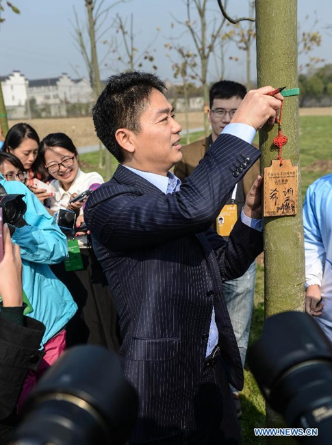 Liu Qiangdong (front), CEO of e-commerce company JD.com, signs a tag after planting a tree to mark the 2014 World Internet Conference in Wuzhen, east China's Zhejiang Province, Nov. 20, 2014. (Xinhua/Xu Yu)