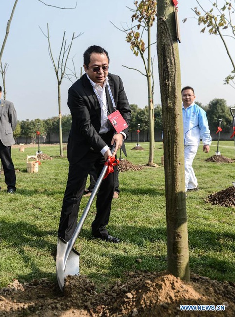 Zhou Hongyi, chairman of Qihoo 360 Technology Co. Ltd, plants a tree to mark the 2014 World Internet Conference in Wuzhen, east China's Zhejiang Province, Nov. 20, 2014. (Xinhua/Xu Yu)