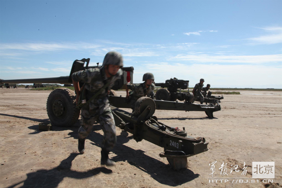 In this autumn, a field artillery brigade of the 27th Group Army of the PLA maneuvers from northwest China to the beach of the Bohai Sea to conduct a live-fire drill and successfully hit a dozen of mobile targets on the sea. (BJ.81.cn/Chang Tianlong)