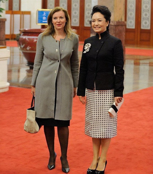 Peng Liyuan takes photos with the girlfriend of French President Francois Hollande. (Photo/ forum.china.com.cn)