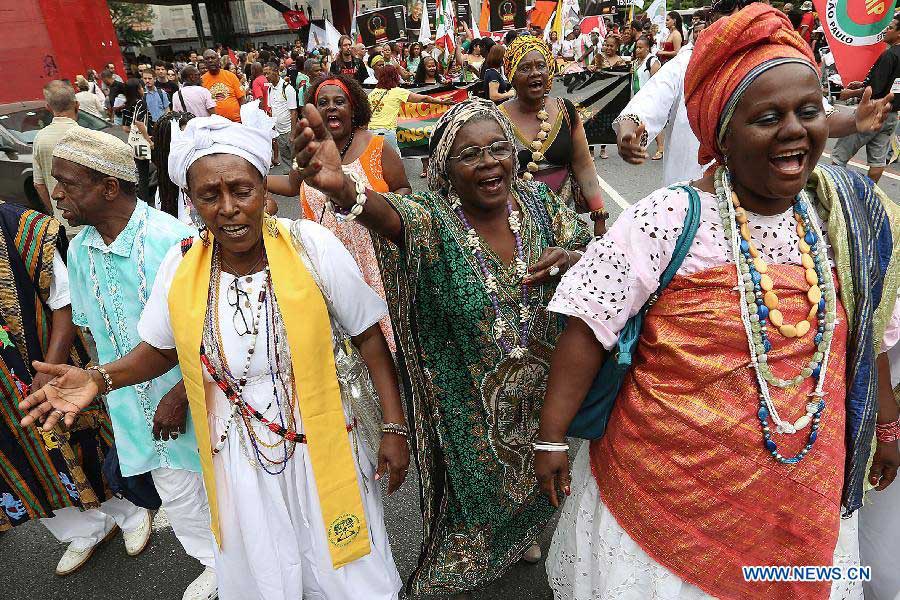 People take part in the celebration of Black Consciousness Day in Sao Paulo, Brazil, on Nov. 20, 2014. The Day of Black Consciousness was first celebrated in 1978 to commemorate Zumbi dos Palmares, a black Brazilian who led a group of runaway slaves in Brazil, known as the Quilombo dos Palmares, to fight the then Portuguese colonizers in the 17th century and was killed in an ambush on Nov. 20, 1695. (Xinhua/ Rahel Patrasso)