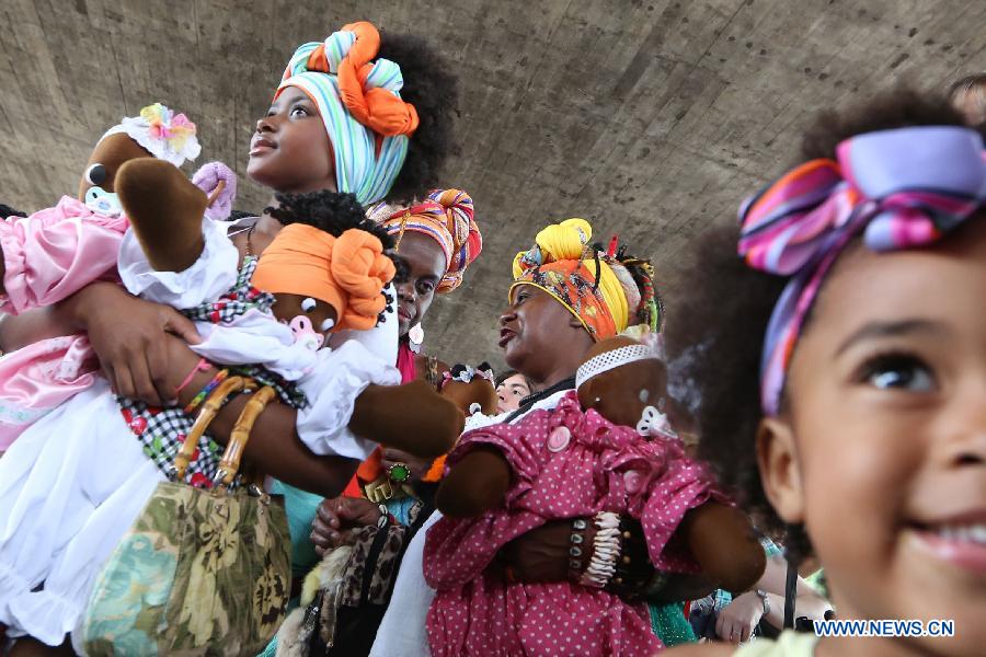 People take part in the celebration of Black Consciousness Day in Sao Paulo, Brazil, on Nov. 20, 2014. The Day of Black Consciousness was first celebrated in 1978 to commemorate Zumbi dos Palmares, a black Brazilian who led a group of runaway slaves in Brazil, known as the Quilombo dos Palmares, to fight the then Portuguese colonizers in the 17th century and was killed in an ambush on Nov. 20, 1695. (Xinhua/ Rahel Patrasso)