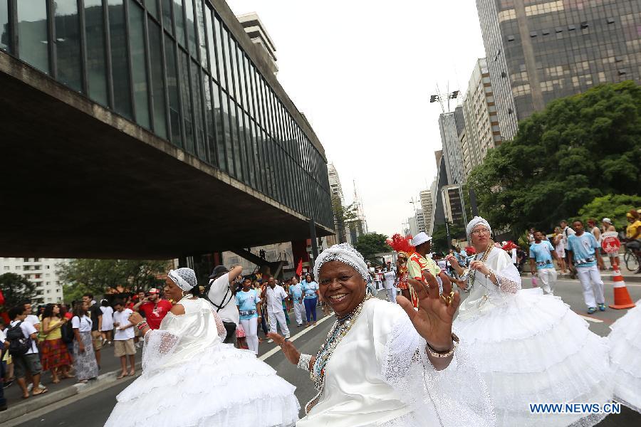 People take part in the celebration of Black Consciousness Day in Sao Paulo, Brazil, on Nov. 20, 2014. The Day of Black Consciousness was first celebrated in 1978 to commemorate Zumbi dos Palmares, a black Brazilian who led a group of runaway slaves in Brazil, known as the Quilombo dos Palmares, to fight the then Portuguese colonizers in the 17th century and was killed in an ambush on Nov. 20, 1695. (Xinhua/ Rahel Patrasso)
