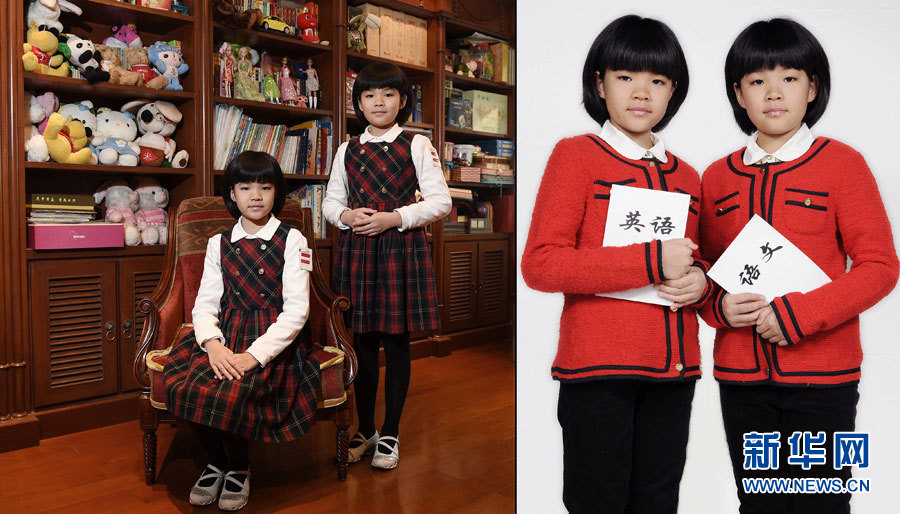 Left: Photo taken on Nov. 8 2014 shows 10-year-old twin sisters Chong Kexin (R) and Chong Keying. Their parents both work in financial industry. Right: Photo taken on Nov. 10, 2014 shows Chong Kexin (R), who aims to be a Chinese teacher and Chong Keying who dreams to be an English teacher. (Photo/Xinhua)