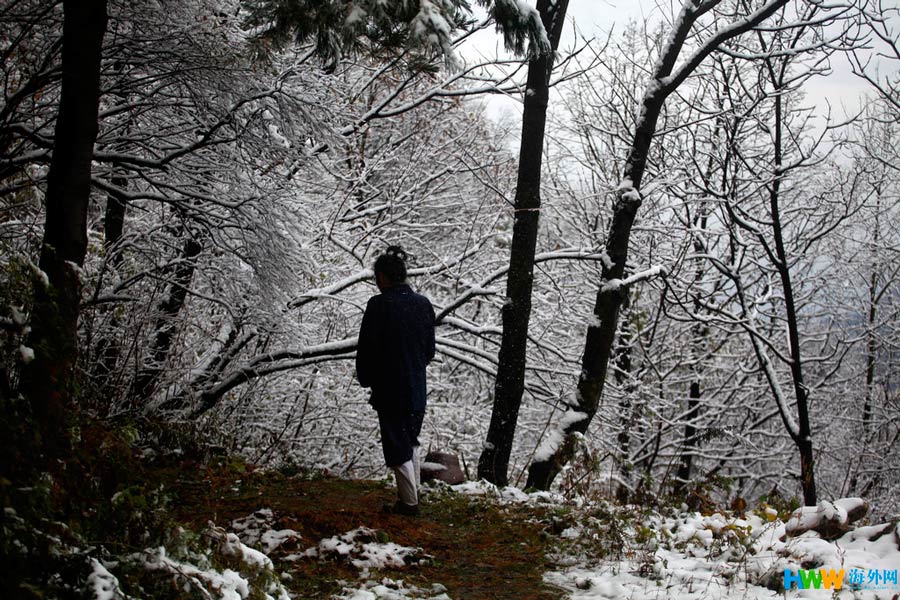 A hermit stands outside his house in the snow. (Photo/haiwainet.cn)