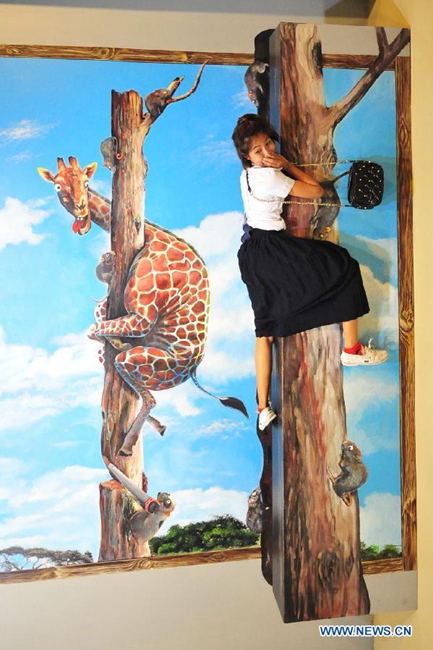 A visitor poses for photos at Magic Art Museum in Bangkok, Thailand, Nov. 24, 2014. The Magic Art Museum Bangkok presents modern 3D art works. (Xinhua/Rachen Sageamsak)