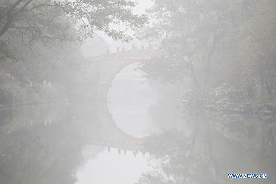 Tourists visit the fog-enveloped Wan'an Bridge in Hangzhou, capital of east China's Zhejiang Province, Nov. 23, 2014. (Xinhua/Li Zhong)