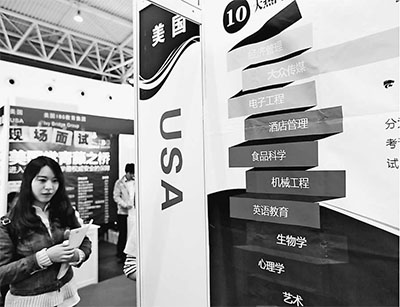 | A student consults a US exhibition booth at the 2014 China International Education Exhibition Fair, Beijing. (Photo/People's Daily) |