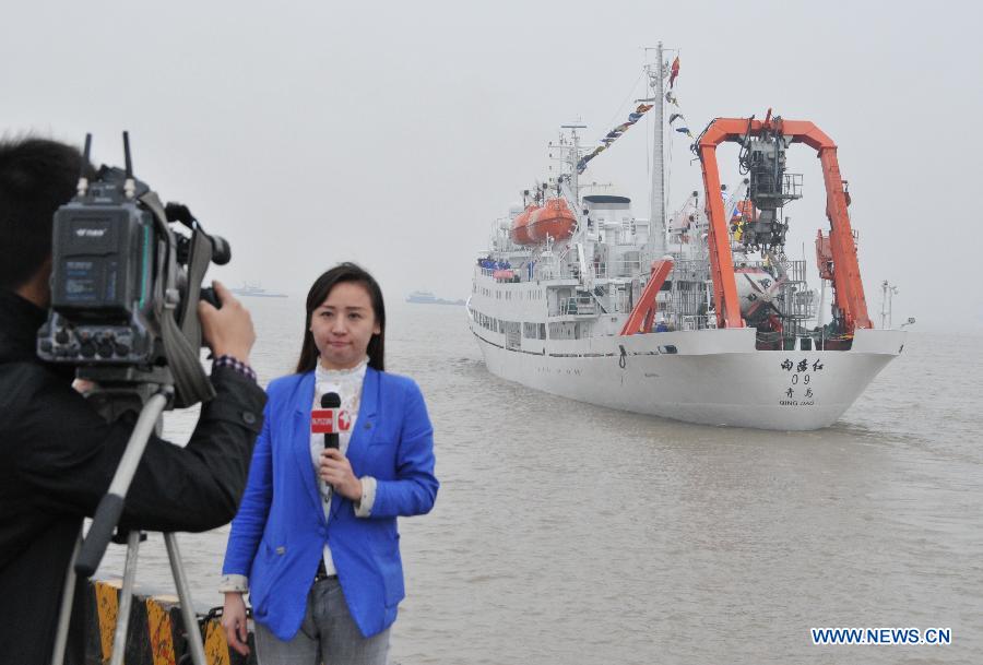 A journalist reports as China's manned submersible Jiaolong with its carrier, Xiangyanghong 09, sets sail from Jiangyin City, east China's Jiangsu Province, Nov. 25, 2014. Jiaolong started a scientific research voyage to the southwest Indian Ocean on Tuesday. (Xinhua/Zhang Xudong)