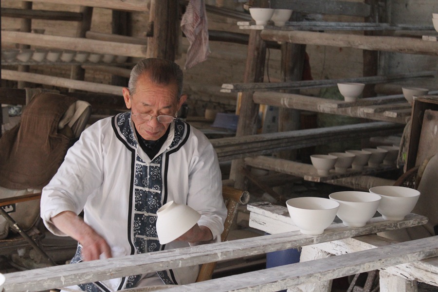 An elderly porcelain artist trims unfired porcelain products at the Jingdezhen Ancient Kilns in Jingdezhen city, Jiangxi province on Nov. 18, 2014. (Photo/People's Daily Online)