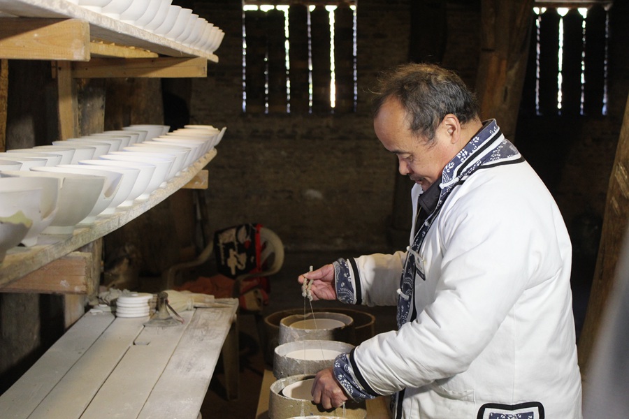 An elderly porcelain artist paints a porcelain piece at the Jingdezhen Ancient Kilns in Jingdezhen city, Jiangxi province on Nov. 18, 2014. (Photo/People's Daily Online)