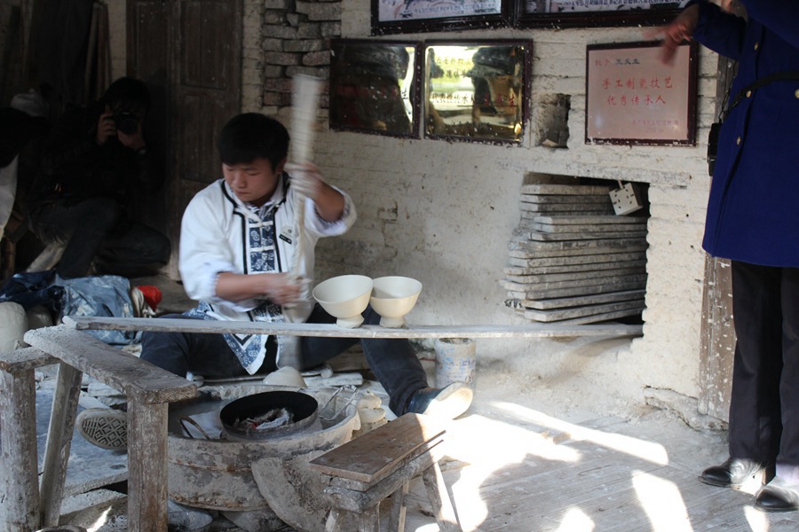 A young porcelain apprentice shapes unfired bowls by hand in the workshop at the Jingdezhen Ancient Kilns in Jingdezhen city, Jiangxi province on Nov. 18, 2014. (Photo/People's Daily Online)