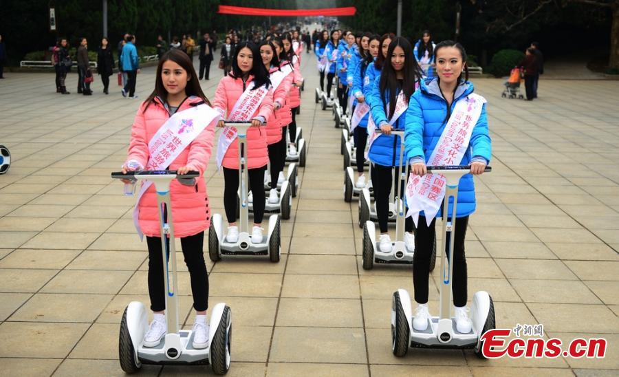 School beauties from over 20 Chinese universities ride two-wheeled scooters during a competition in Changsha, Hunan province on November 26, 2014. The event was held to promote low-carbon choices of transportation. [Photo/ Yang Huafeng]
