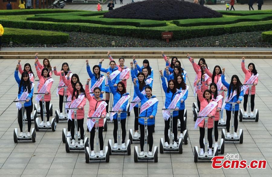 School beauties from over 20 Chinese universities ride two-wheeled scooters during a competition in Changsha, Hunan province on November 26, 2014. The event was held to promote low-carbon choices of transportation. [Photo/ Yang Huafeng]