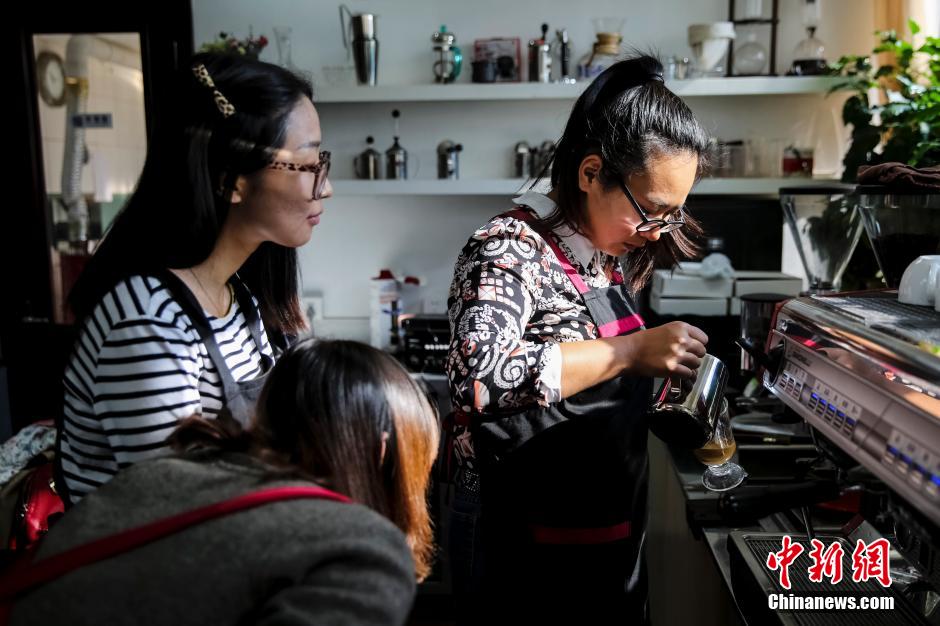 Compared with other classmates at the class, Shanshan is more sophisticated and experienced in coffee-making. Sometimes, the teacher would ask her to demonstrate again for other students. (Chinanews/Xiong Ran)