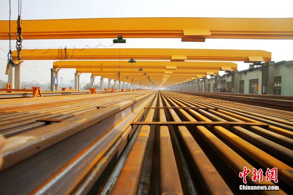 500-meter-long tracks lying in Xiangtang welding workshop. (CNS/Zhang Weidong)
