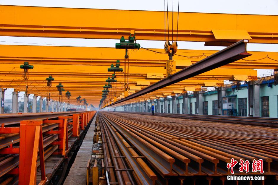 500-meter-long tracks lying in Xiangtang welding workshop. (CNS/Zhang Weidong)