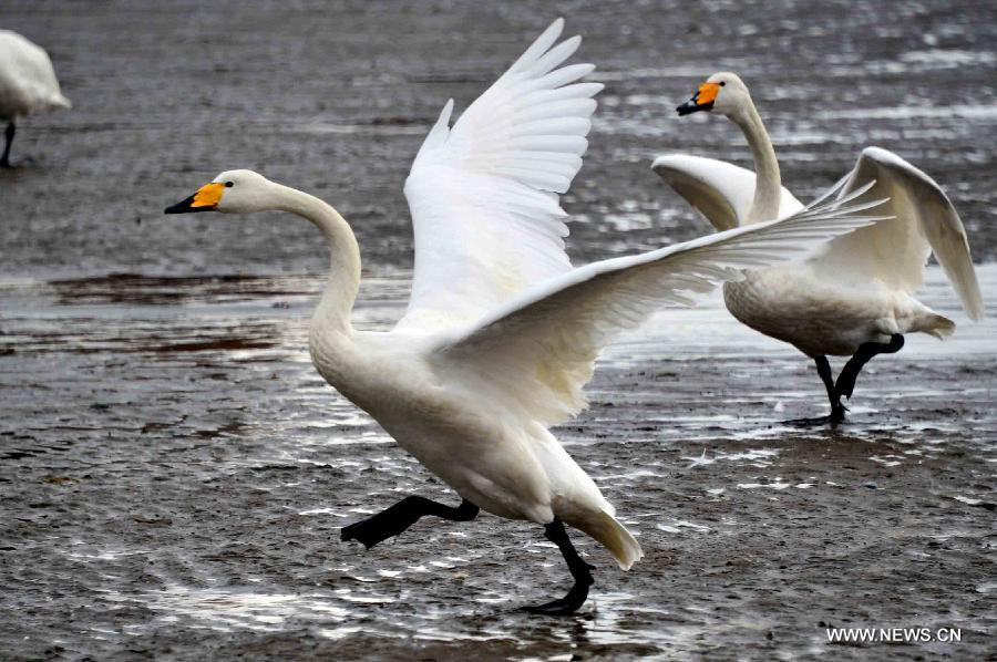 Swans look for food on a lake in Rongcheng, east China's Shandong Province, Nov. 28, 2014. Several tens of thousands of swans migrating from Siberia converged in Rongcheng to pass the winter recently. (Xinhua/Guo Xulei)