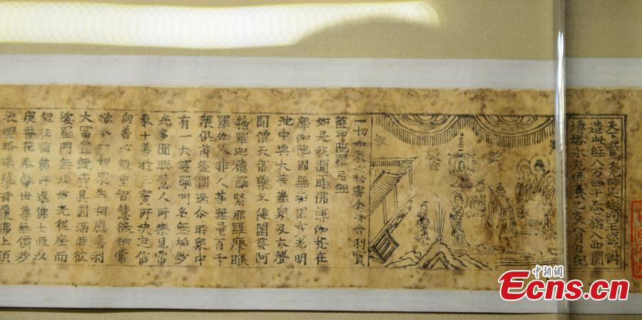 A printed classic hidden in the previous Leifeng Pagoda is on display at the Zhejiang Provincial Museum in Hangzhou, Zhejiang province, Nov 27, 2014. [Photo: China News Service /Li Chenyun]