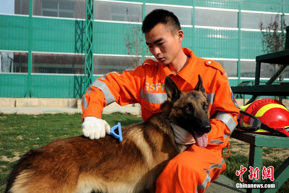 The fireman and his rescue dogs. (CNS/Shi Yonghong)