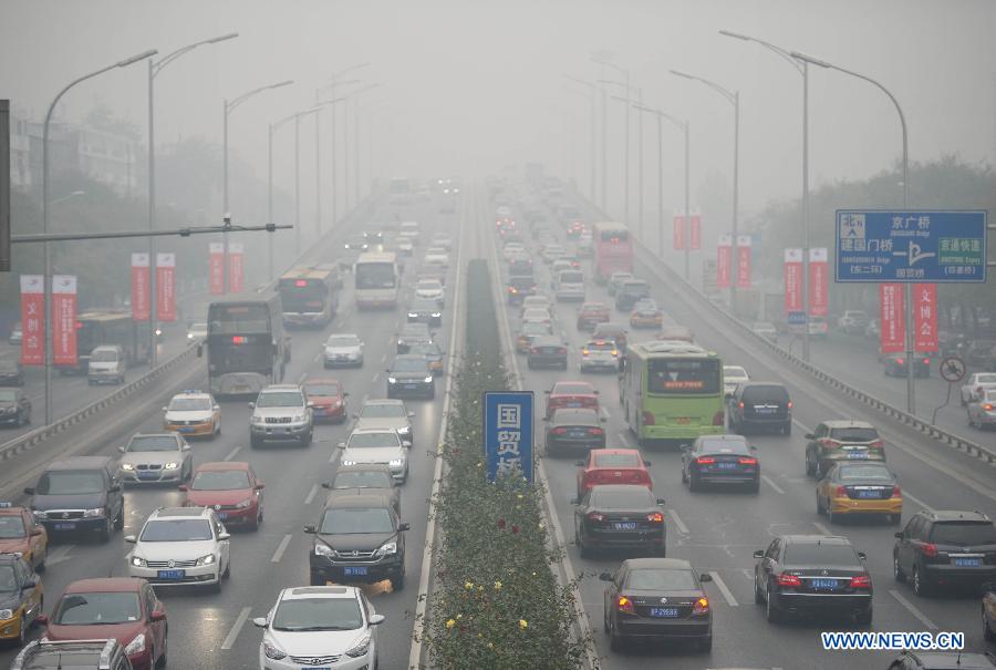 Vehicles and pedestrians are seen in heavy smog in Beijing, capital of China, Nov. 29, 2014. China's capital city was again caught in a heavy smog on Saturday. Beijing's municipal air pollution control authorities recorded an AQI (air quality index) reading of 300, which denotes very unhealthy air quality. (Xinhua/Li Wen)