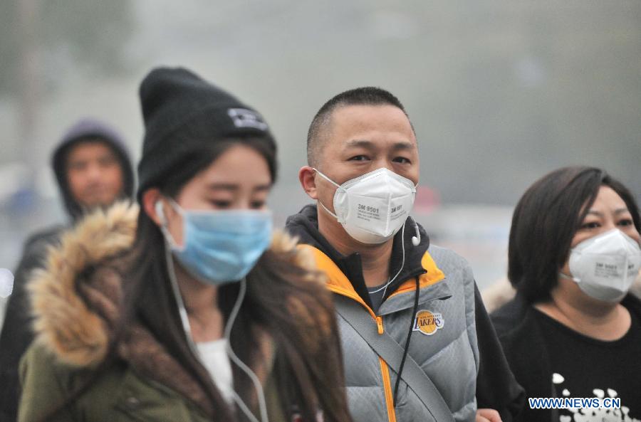 Pedestrians wear facial mask respirators against heavy smog in Beijing, capital of China, Nov. 29, 2014. China's capital city was again caught in a heavy smog on Saturday. Beijing's municipal air pollution control authorities recorded an AQI (air quality index) reading of 300, which denotes very unhealthy air quality. (Xinhua/Li Wen)