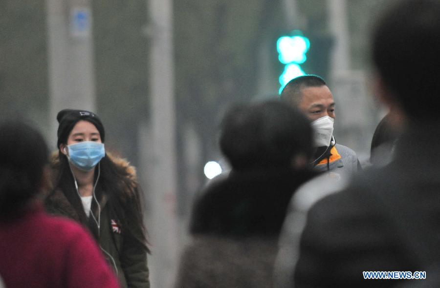 Pedestrians wear facial mask respirators against heavy smog in Beijing, capital of China, Nov. 29, 2014. China's capital city was again caught in a heavy smog on Saturday. Beijing's municipal air pollution control authorities recorded an AQI (air quality index) reading of 300, which denotes very unhealthy air quality. (Xinhua/Li Wen)