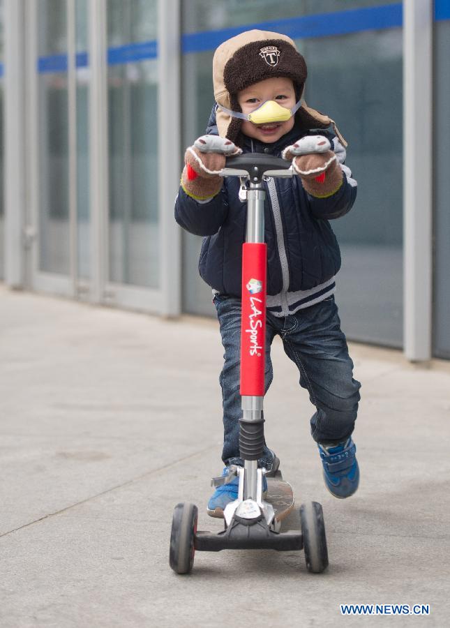 A kid wears a nose mask respirator against heavy smog as he plays with a kick scooter in Beijing, capital of China, Nov. 29, 2014. China's capital city was again caught in a heavy smog on Saturday. Beijing's municipal air pollution control authorities recorded an AQI (air quality index) reading of 300, which denotes very unhealthy air quality. (Xinhua/Luo Xiaoguang)