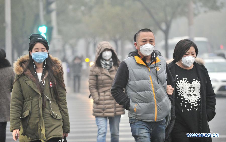 | Pedestrians wear facial mask respirators against heavy smog in Beijing, capital of China, Nov. 29, 2014. China's capital city was again caught in a heavy smog on Saturday. Beijing's municipal air pollution control authorities recorded an AQI (air quality index) reading of 300, which denotes very unhealthy air quality. (Xinhua/Li Wen) |