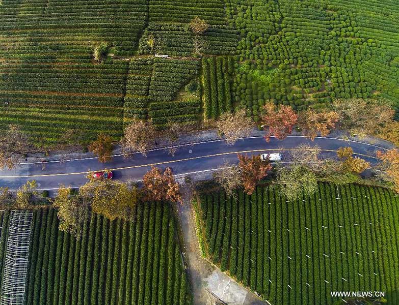 This bird eye view shows trees along a road in the scenic spot of West Lake in Hangzhou, capital of east China's Zhejiang Province, Dec. 1, 2014. (Xinhua/Xu Yu)