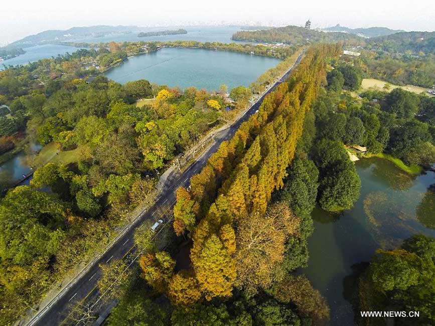 This bird eye view shows trees along a road in the scenic spot of West Lake in Hangzhou, capital of east China's Zhejiang Province, Dec. 1, 2014. (Xinhua/Xu Yu)