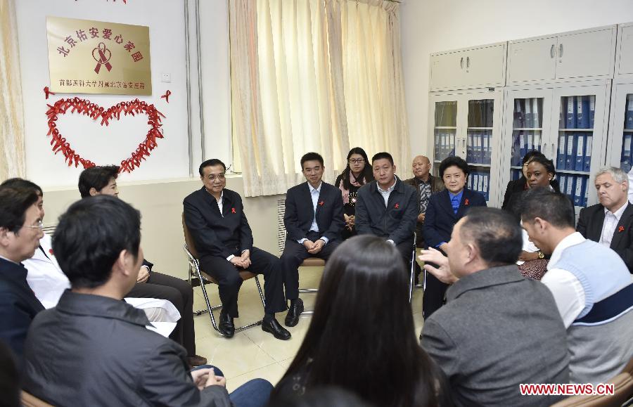 Chinese Premier Li Keqiang talks with representatives of medical specialists, volunteers and international organization workers during his visit to Beijing's YouAn Hospital, home to a center for HIV/AIDS treatment, in Beijing, capital of China, ahead of World AIDS Day. (Xinhua/Xie Huanchi)