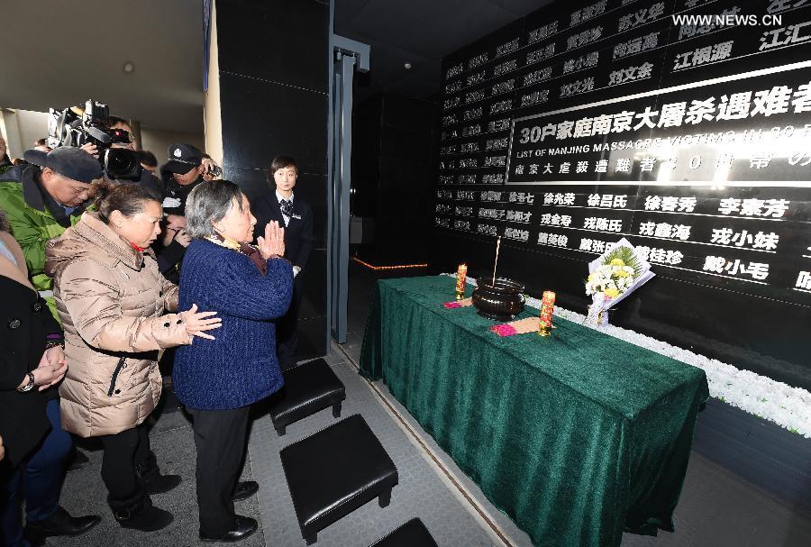Xia Shuqin, a survivor of the Nanjing Massacre, mourns her family members in front of a wall with "List of Nanjing Massacre Victims in 30 Families" at the Memorial Hall of the Victims in Nanjing Massacre by Japanese Invaders in Nanjing, capital of east China's Jiangsu Province, Dec. 1, 2014. A series of ceremonies were held by people to mourn their family members killed in the 1937 massacre ahead of the National Memorial Day for Nanjing Massacre Victims, which falls on Dec. 13. (Xinhua/Sun Can)