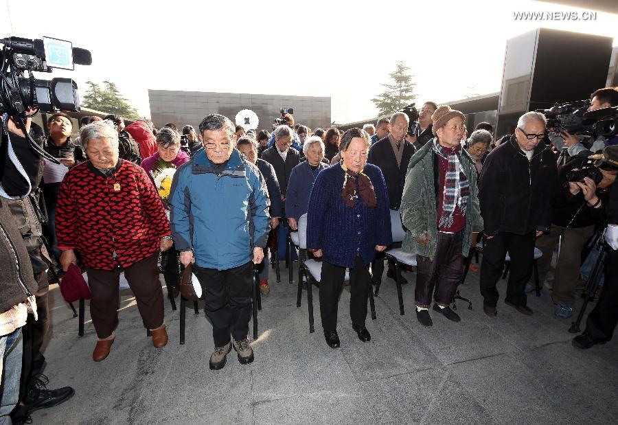Survivors of the Nanjing Massacre and their family members mourn in front of a wall with "List of Nanjing Massacre Victims in 30 Families" at the Memorial Hall of the Victims in Nanjing Massacre by Japanese Invaders in Nanjing, capital of east China's Jiangsu Province, Dec. 1, 2014. A series of ceremonies were held by people to mourn their family members killed in the 1937 massacre ahead of the National Memorial Day for Nanjing Massacre Victims, which falls on Dec. 13. (Xinhua/Sun Can)